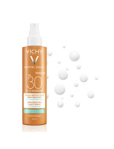 La première protection solaire en format spray de chez Vichy dédiée aux amoureux de la plage et de la piscine ayant la peau déshydratée.