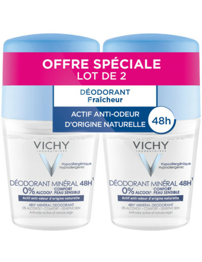 Vichy Déodorant Minéral 48H Roll-On Lot de 2 x 50 ml est un déodorant minéral sans sels d'aluminium, sans alcool, sans paraben qui convient à toutes les peaux, même fraîchement épilées.