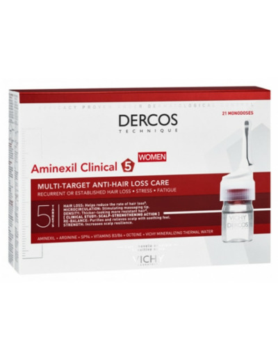 Vichy Dercos Aminexil Clinical 5 Femme 21 Monodoses est un soin traitant anti-chute qui agit en 5 actions ciblées sur le cheveu. Il est idéal pour les femmes dont la chute de cheveu est récurrente ou installée.
