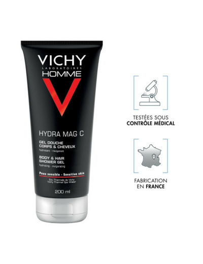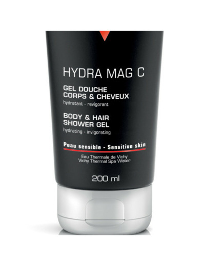 Le gel douche Hydra Mag C de Vichy pour homme permet un nettoyage quotidien du corps et des cheveux. Il est composé de magnésium et de vitamine C glycosylée qui ont pour mission de recharger votre peau en énergie. Bien que formulé sans savon et enrichi en agent hydratant, ce gel douche limite le dessèchement mais n’est pas hypoallergénique. Testé sous contrôle dermatologique et ophtalmologique, sa formulation au pH physiologique nettoie et hydrate en douceur le corps et les cheveux. Frais et agréable,ce gel douche corps et cheveux des laboratoires Vichy mousse rapidement et sa texture est légère dans la main. Il est pratique de par son action 2 en 1 et son format qui peut se transporter facilement lors d’un départ en vacances. Le gel douche Homme Hydra Mag C sera également l’allié préféré des sportifs. Avec son parfum tonique aux accords légèrement boisés, il mettra en avant votre virilité pour une journée au confort extrême. Son effet frais et dynamique est immédiat sur la peau. Il prend soin de votre cuir chevelu et vous assure des cheveux légers. A la sortie de la douche, votre peau est lisse et parfumée d’une odeur discrète et agréable. Votre peau est douce et respectée !