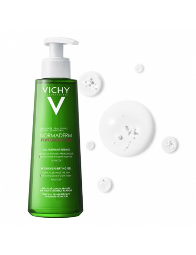 Normaderm Phytosolution gel purifiant intense, le premier gel nettoyant purifiant pour les peaux grasses à tendance acnéique des laboratoires Vichy, enrichi en minéraux et en probiotique, qui élimine parfaitement les impuretés et l’excès de sébum. La peau est matifiée et regraisse moins vite. Les pores et les points noirs sont réduits.