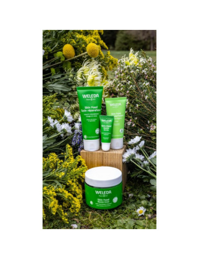 Weleda Skin Food Baume Corps Soin Nourrissant Intensif 150 ml est un soin pour le corps qui nourrit et apaise la peau. Ce baume est spécialement formulé pour les peaux sèches à très sèches. L'extrait de pensée sauvage qu'il contient est connu pour ses propriétés apaisantes et adoucissantes. Le baume corps Skin Food de Weleda est destiné aux peaux sèches à très sèches qui recherchent un confort et une nutrition intensive. Sa texture baume apporte une réparation et pénètre rapidement sans laisser de film gras. Le principal composant de Weleda Skin Food Baume Corps Soin Nourrissant Intensif est l'extrait de pensée sauvage, apaisante et adoucissante qui est connue pour ses vertus curatives contre les démangeaisons depuis le Moyen-âge et utilisée pour traiter certaines affections cutanées comme l'eczéma, le psoriasis, la séborrhée. La pensée sauvage est riche en mucilages et en saccharides qui apportent un effet émollient et protecteur à la peau. Le benjoin aux propriétés désinfectantes et curatives est utilisé depuis l'Antiquité dans les liturgies indiennes, bouddhistes et catholiques mais aussi pour purifier la chambre des malades en assainissant l'air. Subtilement vanillé, on le reconnaît à ses notes suaves et sensuelles et apporte un plaisir olfactif menant à la relaxation et au bien-être. L'orange est composée de flavonoïdes et de polyphénols qui permettent aux cellules de lutter contre les radicaux libres responsables de l'altération cutanée. De plus, elle est dotée de la vitamine C qui stimule la production de collagène et d'élastine apportant un souplesse et une tonicité à la peau. La lavande est réputée pour ses différentes actions cutanées car elle purifie, apaise et répare les problèmes de peau tel que les dermites, l'eczéma, le psoriasis, l'acné. Enfin, elle possède un pouvoir de relaxation qui procure un sentiment de sérénité. Le baume Skin Food nourrit intensément tous les types de peaux même les plus fragiles et soulage naturellement les états de peaux lésées grâce aux beurres de karité Bio et de cacao Bio.