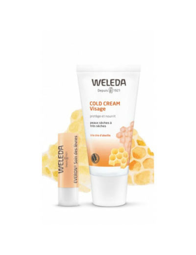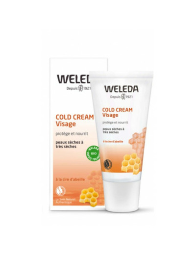 Weleda Cold Cream Visage 30 ml, est un soin du visage spécifiquement élaboré pour les peaux sèches à très sèches afin de les soulager de la sensation de tiraillement et de leur rendre leur souplesse. Digne héritière du célèbre cérat de Galien, une pommade à base d’huile d’olive, de cire d’abeille et d’eau découvert par le médecin grec Claude Galien au milieu du IIème siècle, cette crème reprend les fondamentaux, ne substituant que l’huile d’amande douce à l’huile d’olive. Utilisée bien avant Galien par les Egyptiens antiques dans la préparation d’onguent de massage, l’huile d’amande douce dispose de vertus adoucissantes et émollientes qui apaisent immédiatement les irritations de la peau et nourrit son derme pour une meilleure pénétration de l’eau et ainsi une hydratation optimale. La peau est assouplie, l’épiderme repulpé. Agent de texture épaississant très prisé des laboratoires pharmaceutiques et cosmétiques, la cire d’abeille est également utilisée comme agent filmogène dans les produits de soin de la peau et du visage. Elle dépose un léger voile sur la barrière cutanée afin de renforcer ses défenses contre les agressions de la pollution et des bactéries et favorise la cicatrisation des petites lésions qui peuvent se creuser avec le dessèchement progressif l’épiderme. Ce film protecteur qui évite l’évaporation excessive de l’eau corporelle n'entrave pas, pour autant, la respiration naturelle de la peau et ne provoque aucun dommage allergène. En effet, ce cold cream visage Weleda est conçu sans conservateur, ni colorant, ni parfum de synthèse afin de respecter au maximum la nature cutanée du visage.