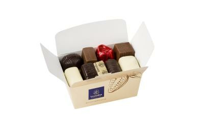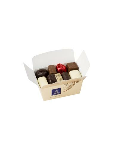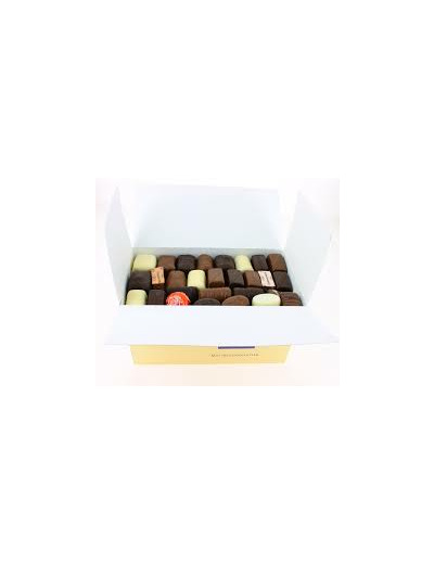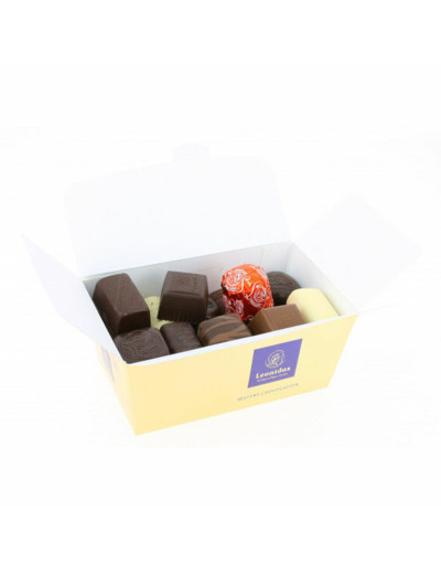 Assortiment de délicieuses pralines au chocolat noir, au lait et blanc fourrées de praliné, de crème caramel et de ganache. Fabrication traditionnelle, 100% pur beurre de cacao.