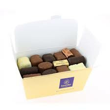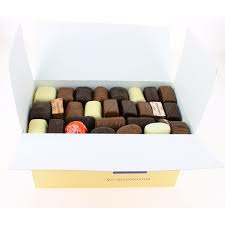 Assortiment de délicieuses pralines au chocolat noir, au lait et blanc fourrées de praliné, de crème et de ganache. Fabrication traditionnelle, 100% pur beurre de cacao.
