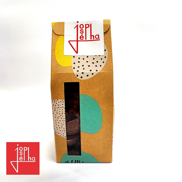Les fritures garnit aux chocolats noir 70% : masse de cacao:70% minimum, sucre et beurre de cacao. Fourré de praliné Amandes du Tarn et Garonne, Noisettes du Gers et de Gianduja, pour un poids d’environ 145gr.