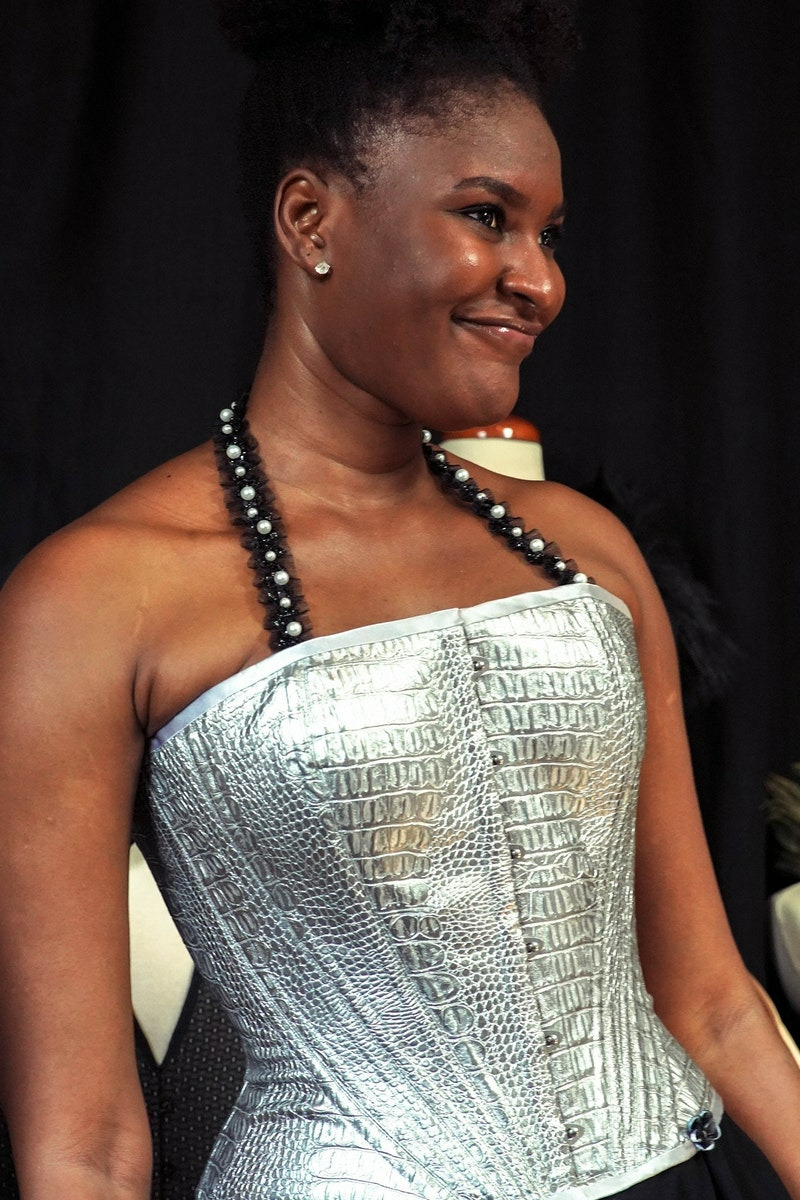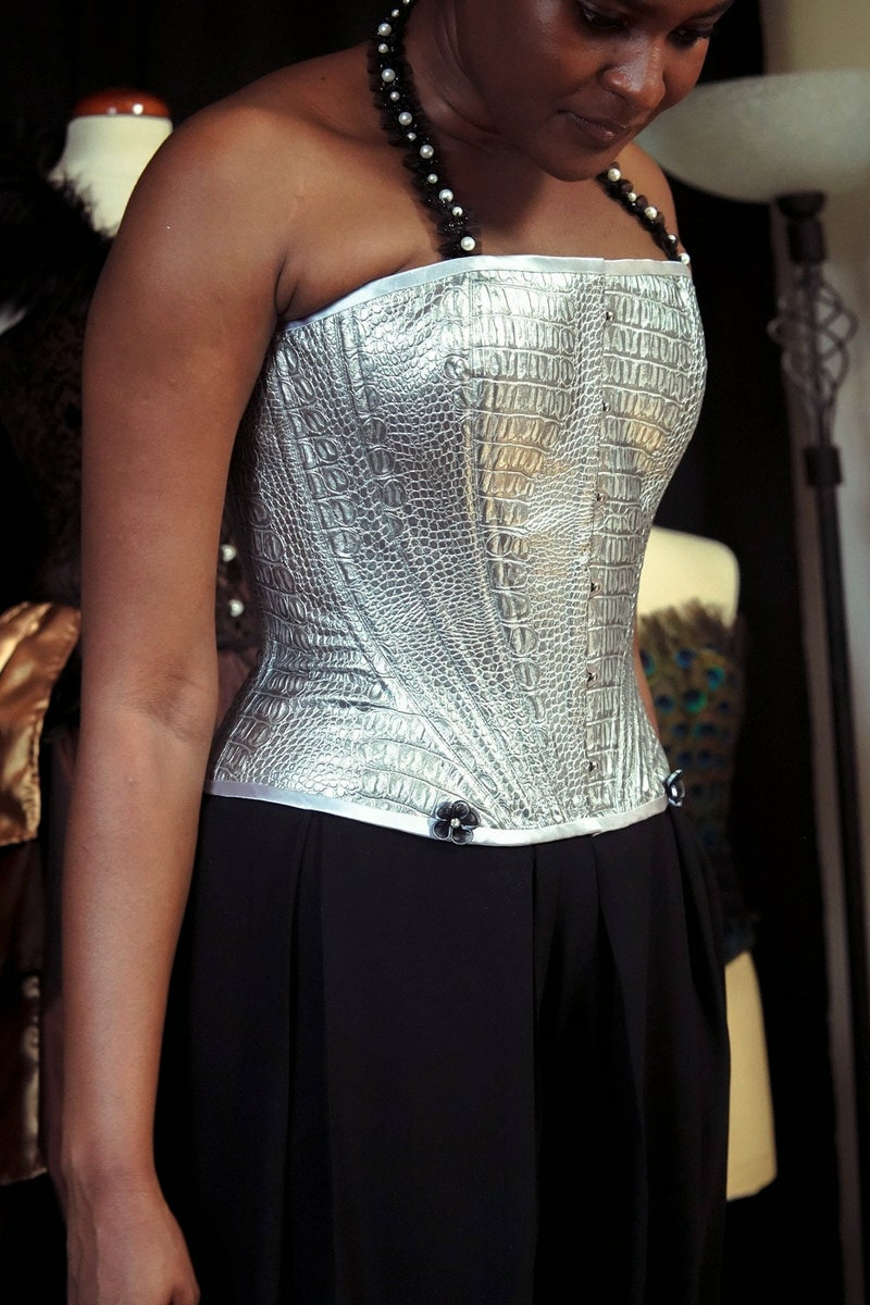 Découvrez notre dernier chef-d'œuvre de corset fait à la main par notre artisan d'art, une pièce unique qui reflète le talent et la passion de la corsetière. Fabriqué en France, ce corset impression serpent argenté est à la fois élégant et audacieux, avec des bretelles noires ornées de perles blanches nacrées pour un effet saisissant.