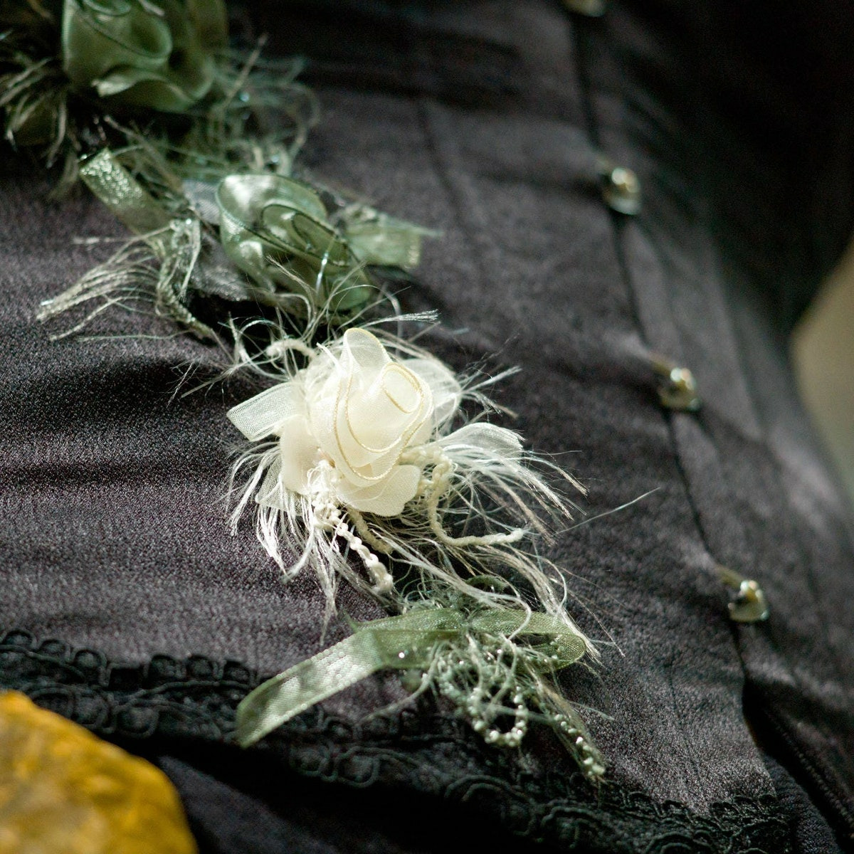 Endroit : satin noir, fleurs en tissu ivoire et vert foncé.