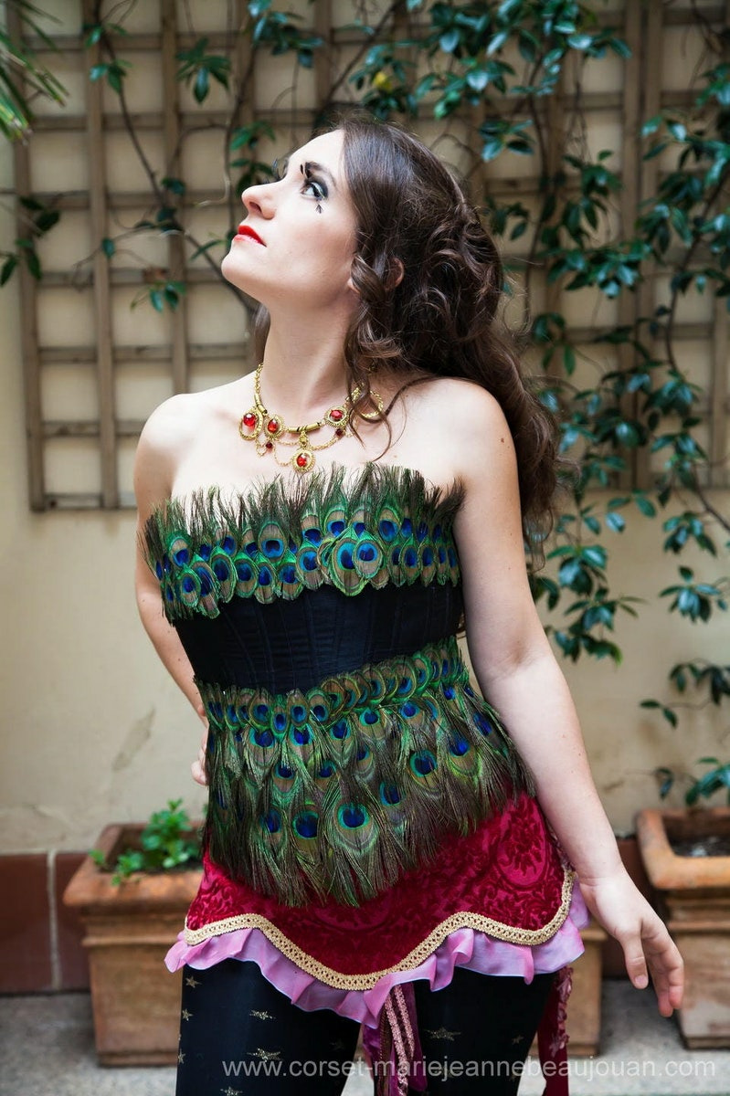 Découvrez ce magnifique corset plumes de paon et satin, entièrement fait main en France par notre corsetière artisan d'art et plumassière. Chaque pièce est unique et représente un travail minutieux et passionné. Les baleines en acier spiralé assurent un maintien parfait, tandis que l'intérieur noir offre un confort inégalé. Les détails en plumes de paon apportent une touche d'élégance et de sophistication à ce corset exceptionnel, qui saura sublimer votre silhouette avec raffinement et originalité.