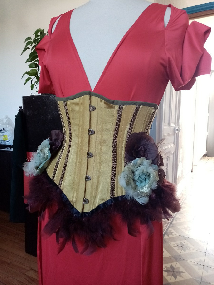 Découvrez ce serre-taille fait main, conçu avec amour par notre artisan d'art corsetière plumassière en France. Fabriqué avec du tissu or et des galons marrons de haute qualité, ce serre-taille est un véritable chef-d'œuvre. Les fleurs en tissu délicates sur les hanches ajoutent une touche de féminité, tandis que le liseret de plumes apporte une touche de glamour et d'originalité. Ce serre-taille et plumes marrons est l'accessoire parfait pour compléter votre tenue et attirer tous les regards. Chaque détail de ce serre-taille a été soigneusement pensé et confectionné avec une grande attention. Faites sensation avec ce serre-taille unique et impressionnant, qui ajoutera une touche de sophistication à votre garde-robe.