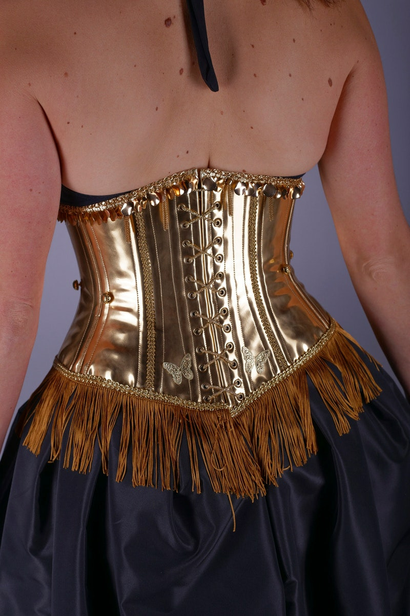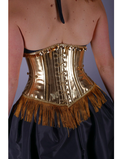 Réhaussez votre garde-robe avec notre exquis Serre-taille en sky or avec cages amovibles, méticuleusement fabriqué à la main par notre artisan corsetière d'art en France. Cette superbe pièce présente un design à cage sur les hanches, orné d'un délicat liseret de fil or et de galons anciens en métal pour une touche d'allure vintage. L'ajout de perles anciennes, de breloques ou de papillons métal dans le dos ajoute une touche fantaisiste et luxueuse à cet accessoire tendance. Rehaussez n'importe quelle tenue avec ce serre-taille magnifiquement conçue, pour accentuer vos courbes naturelles et respirer l'élégance et la sophistication. Fabriqué à la main avec soin et attention aux détails, cette pièce est une véritable œuvre d'art et constituera un ajout étonnant à la collection de tout amateur de mode.