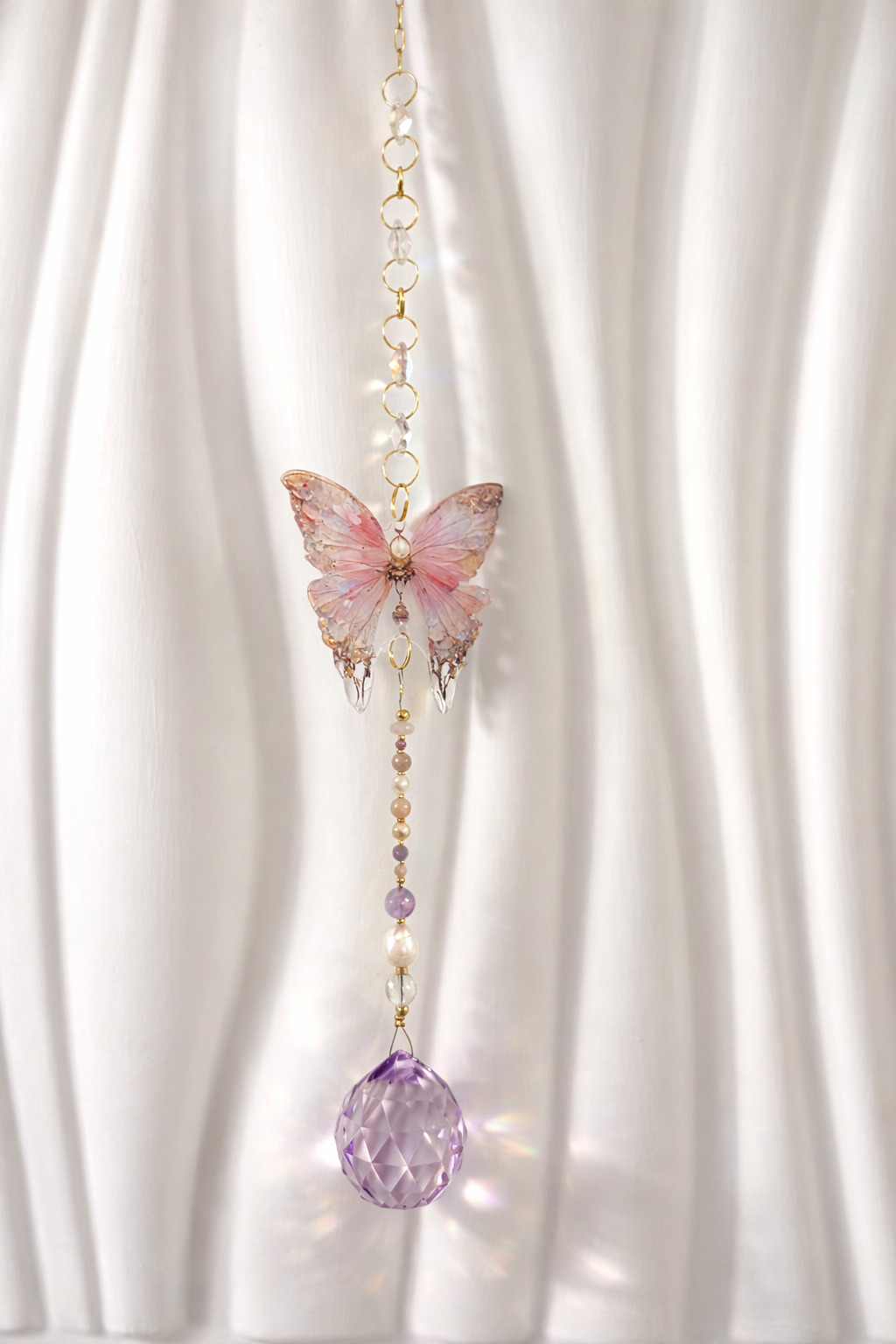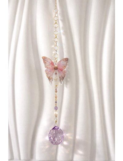 Magnifique attrape soleil décoratif avec un papillon et de délicates perles en pierres naturelles.