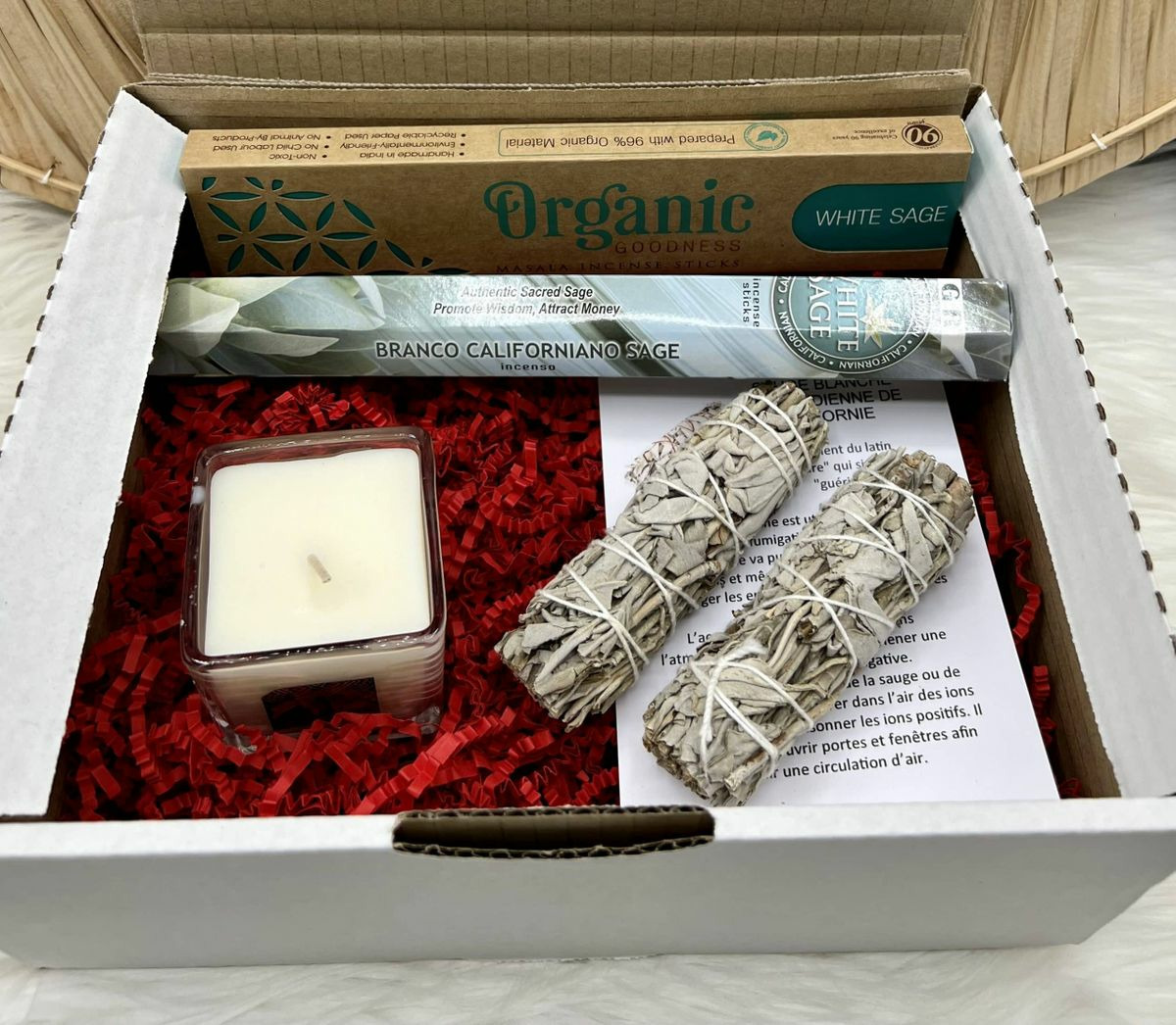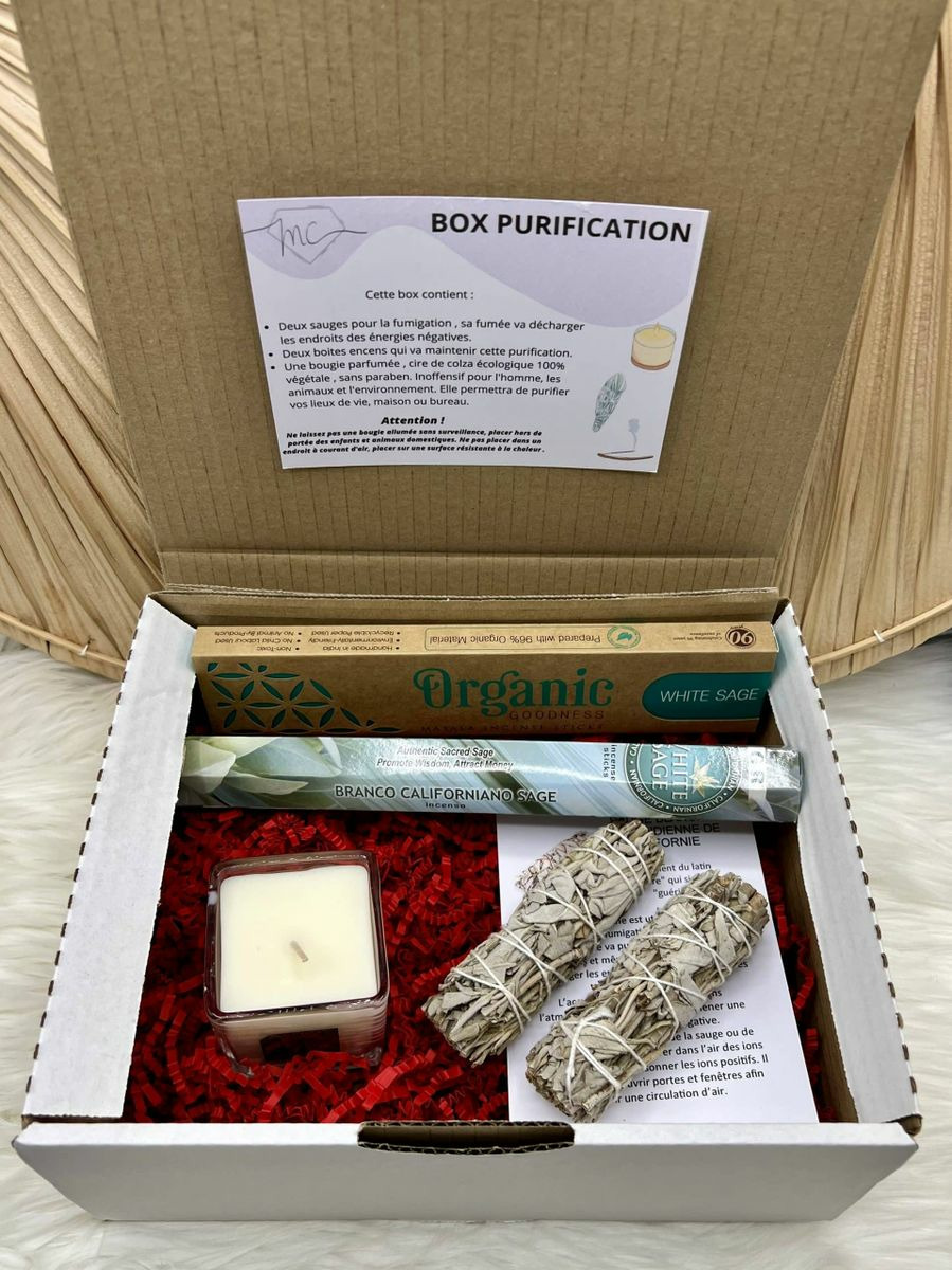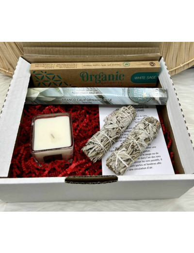 Offrez à votre intérieur une purification énergétique profonde avec la Box Purification maison. Composée de sauge blanche à brûler, d'encens à la sauge blanche et d’une bougie blanche. Cette box est idéale pour éloigner les énergies négatives, purifier votre espace et instaurer une ambiance de paix et de sérénité.