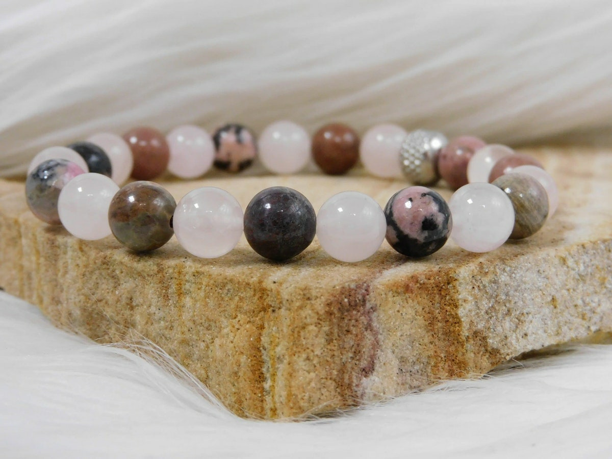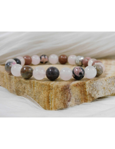 Le bracelet apaisement se compose de perles polies de quartz rose et de rhodonite, chacune mesurant environ 8 mm, un choix qui offre une présence élégante sans être imposante. Les perles de quartz rose arborent un doux rose pâle translucide. Afin que ces perles symbolisant la tendresse et l'amour. Tandis que les perles de rhodonite présentent des nuances allant du rose plus soutenu au brun avec des veines noires distinctives, conférant au bracelet un contraste harmonieux.