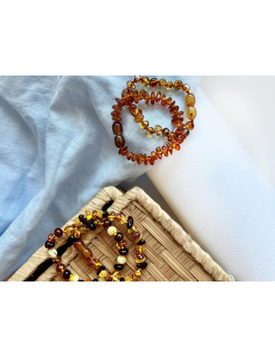 - Soulagement des douleurs dentaires. Le bracelet bébé avec ambre cognac, fermoir vis, 12-13 cm, pourrait apporter un confort aux bébés en période de poussées dentaires. En effet, l'ambre de la Baltique est utile pour les propriétés apaisantes sur les gencives, cette phase délicate plus supportable pour les tout-petits.