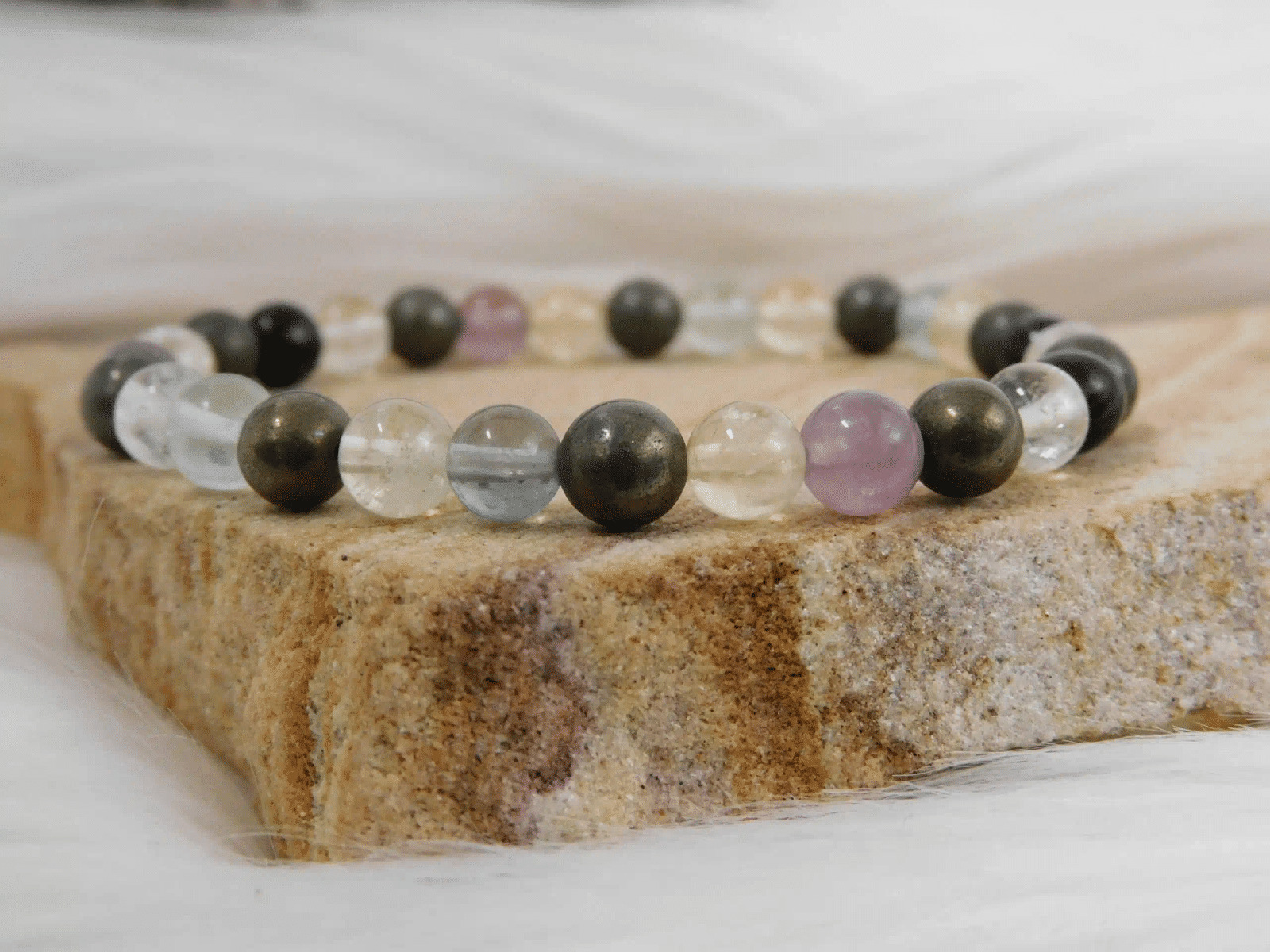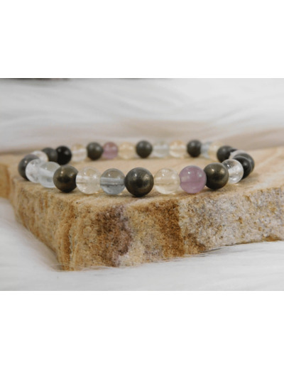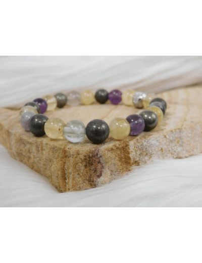 Ce bracelet se distingue par ses perles polies de citrine, fluorine et pyrite, chacune mesurant environ 6mm,8mm ou 10mm. Les perles de citrine, avec leurs teintes jaune doré, apportent une lumière chaleureuse et stimulante. Les perles de fluorine, qui varient du vert pâle au violet, ajoutent des nuances apaisantes et équilibrantes, tandis que la pyrite, avec ses reflets métalliques dorés, offre un contraste audacieux et un éclat unique.
