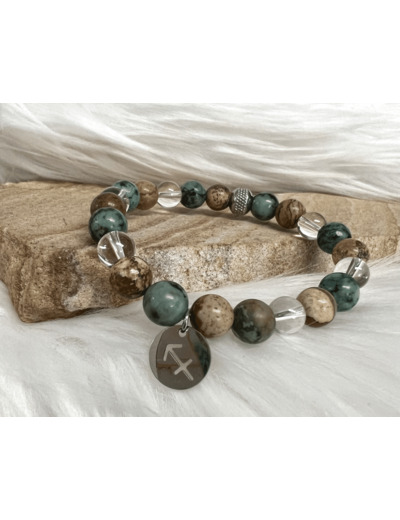 Pour confectionner ce bracelet , nous avons travaillé avec une astrologue afin de définir les traits du caractère du signe, ses atouts et ses faiblesses. En ce qui concerne le signe du Sagittaire, les personnes nées sous ce signe, font parties de l'élément Feu. Pour apaiser ce signe on privilégie les pierres de terre/ eau. L'association des deux synergies Jaspe paysage et Turquoise africaine apporte quiétude , adoucit les caractères durs et les humeurs excessives. Ouvre l'esprit sur toutes les possibilités de la vie. Réduit les pensées négatives, calme les colères. Invite aux partages. Nous rajoutons du cristal de roche pour amplifier ces deux synergies ou de la lave.