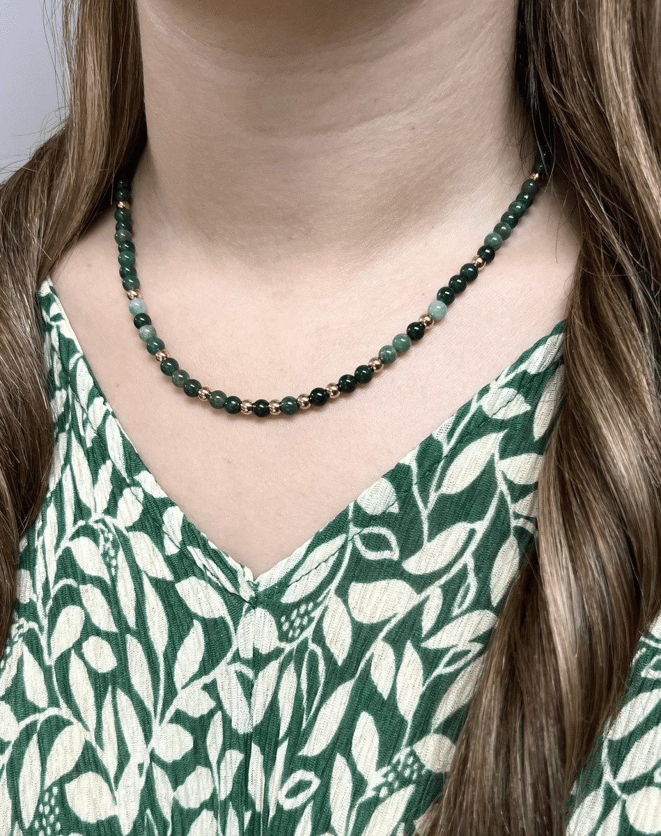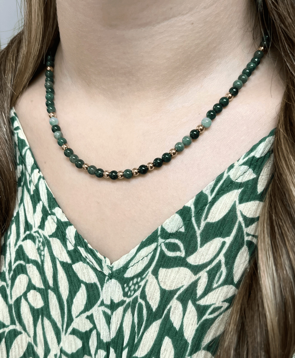 Ce collier enchanteur allie la douceur de l'agate mousse de 6 mm, à la brillance de l'acier doré. Chaque perle d'agate mousse de 6mm, aux nuances uniques de vert et de blanc, évoque la sérénité d'une forêt enchantée. Enfilées sur un délicat fil d'acier inoxydable doré, elles forment un bijou à la fois élégant et intemporel. Le fermoir ajustable permet de l'adapter à toutes les morphologies.
