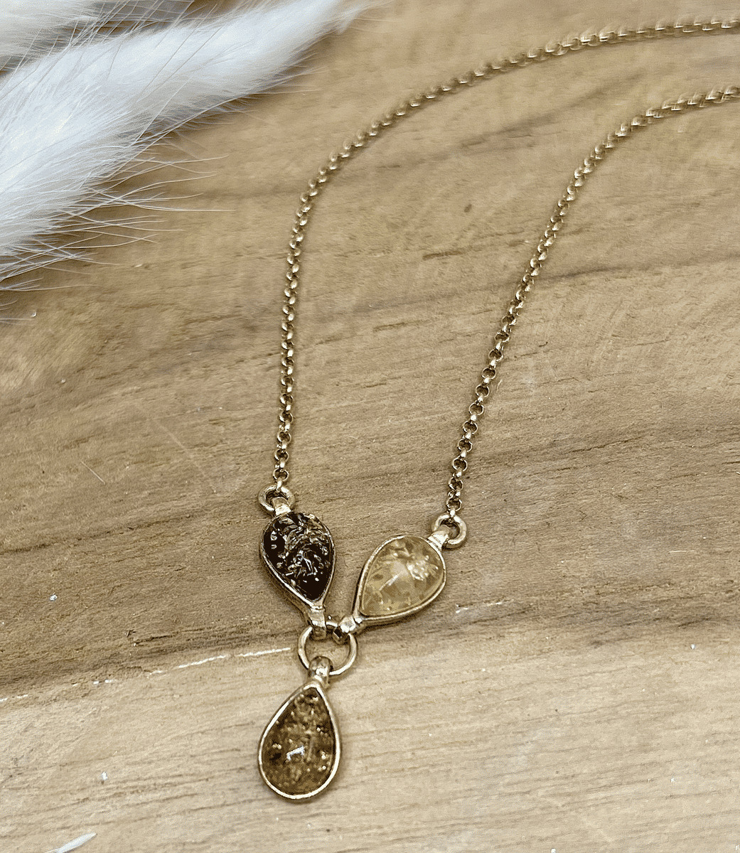 - Précautions spécifiques :Eviter d'exposer le collier à des produits chimiques agressifs, tels que parfums et polluants, qui pourraient altérer l'éclat de l'ambre et du doré. L'ambre peut changer de couleur au contact de l'épiderme.