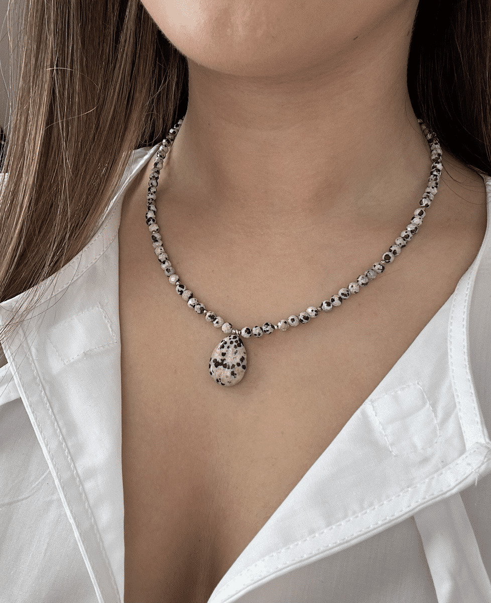 Idéal pour un look bohème chic, ce collier allie beauté et bien-être. Il est parfait pour celles qui cherchent à affirmer leur style tout en profitant des bienfaits des pierres naturelles. Que vous souhaitiez compléter une tenue décontractée ou habillée, ce collier en jaspe dalmatien saura faire la différence.