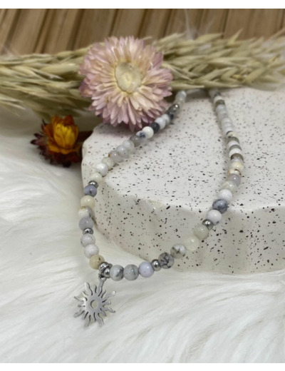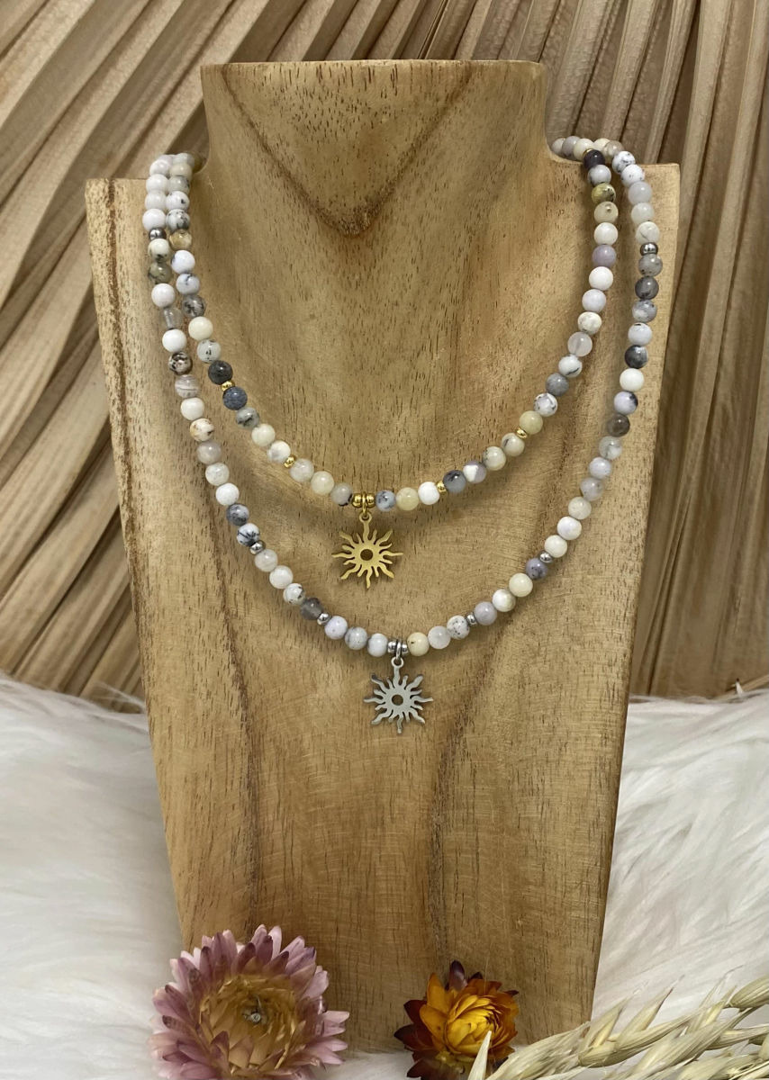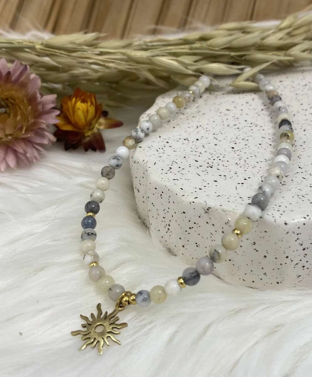 Apportez une touche de douceur et de mystère à votre style avec ce magnifique collier en opale dendritique, composé de perles de 4 mm soigneusement taillées pour révéler les motifs uniques de cette pierre fascinante. L’opale dendritique, aux nuances de blanc, de gris et de noir, est réputée pour favoriser l’ancrage, l’équilibre et la sérénité intérieure. Un bijou délicat et raffiné, parfait pour allier esthétique et bienfaits énergétiques.