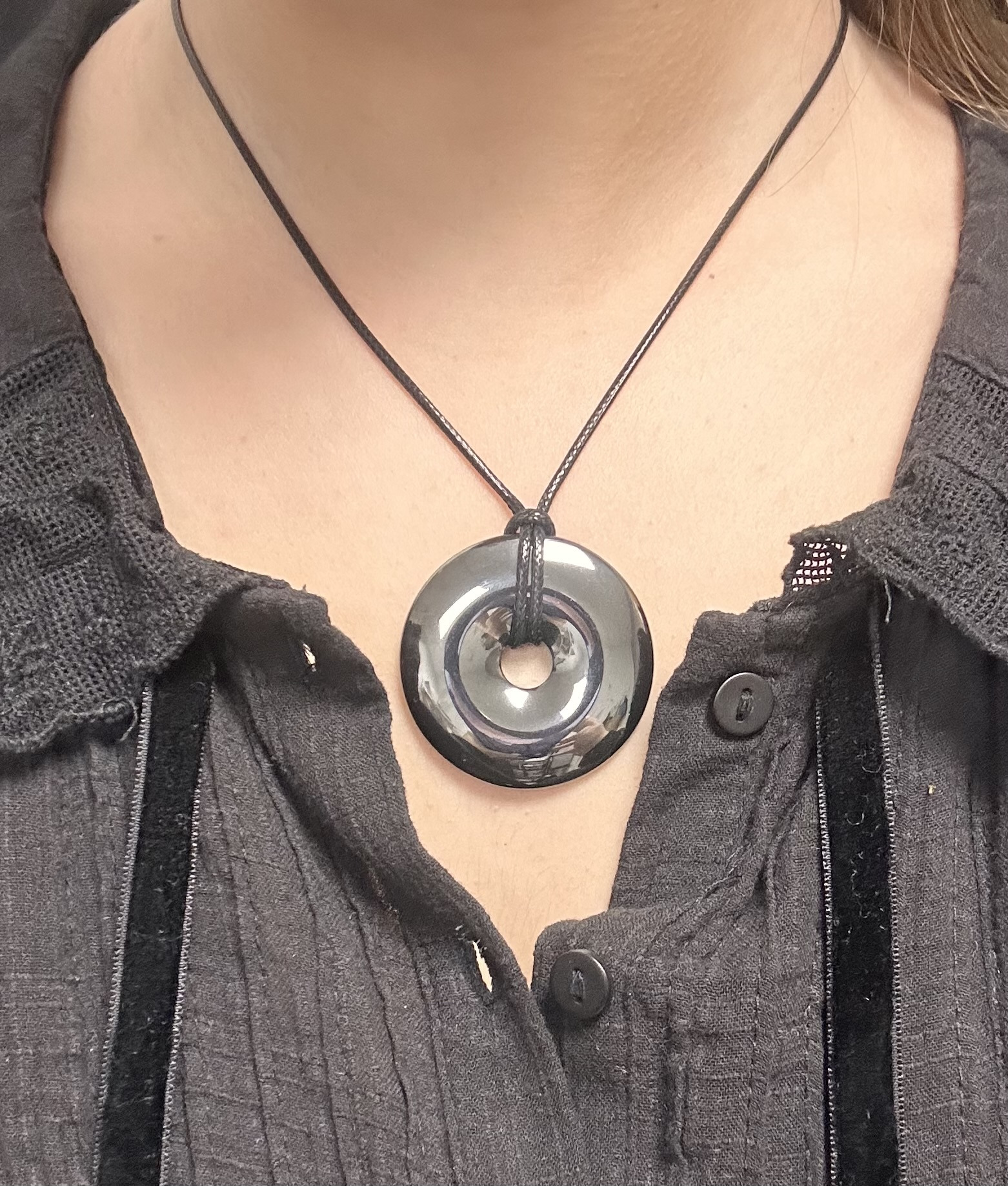 Le pendentif donut en hématite est un bijou en pierre naturelle réputé pour ses vertus d’ancrage puissant, de vitalité et de protection. Sa couleur métallique gris acier évoque la force, la stabilité et l’énergie terrestre. En lithothérapie, l’hématite est utilisée pour renforcer la confiance en soi, favoriser la concentration et protéger des énergies négatives, tout en stimulant la circulation sanguine et la vitalité physique.