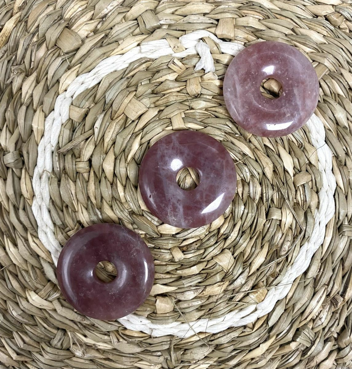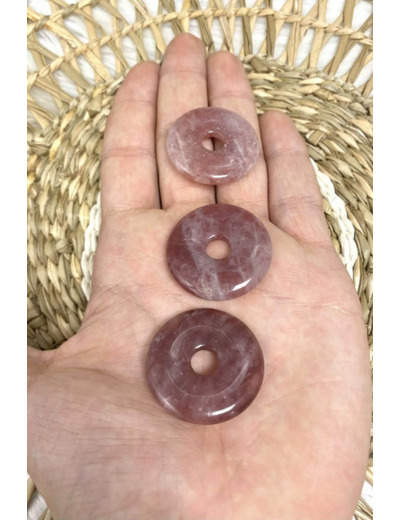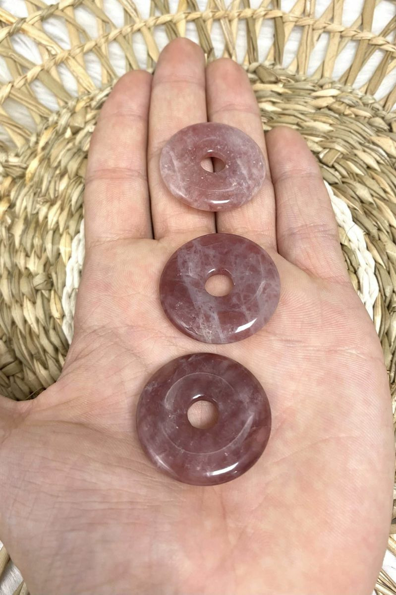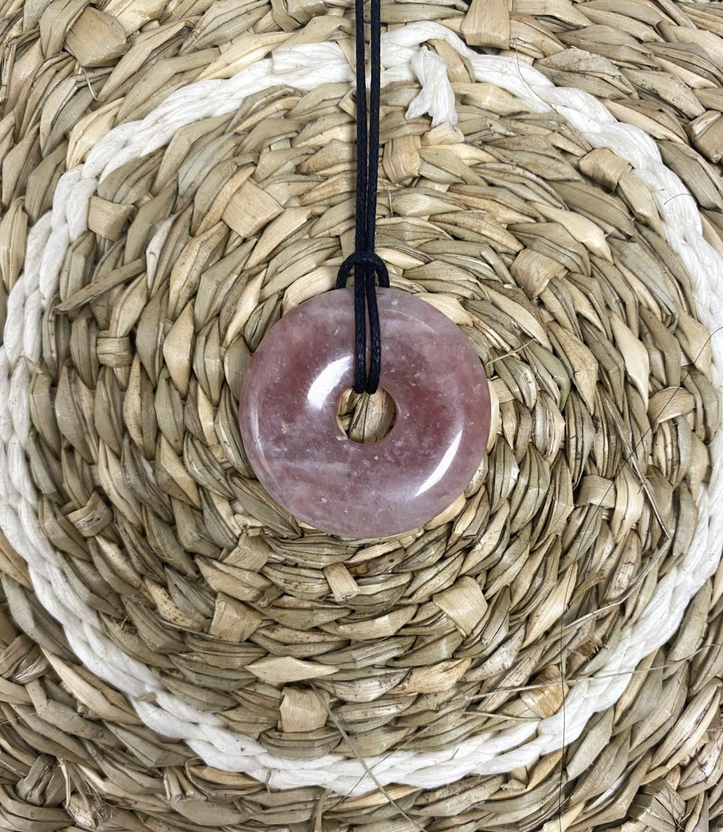 Offrez-vous un bijou à la fois élégant et chargé d'énergie positive avec ce superbe pendentif donut en quartz fraise. Confectionné à partir de quartz fraise 100 % naturel, ce pendentif associe l’esthétique délicate de la pierre à des vertus puissantes en lithothérapie. Sa forme de donut (aussi appelée "pi chinois") est un symbole ancestral de protection, de circulation de l’énergie et d’harmonie.