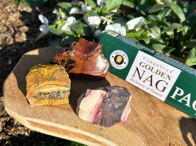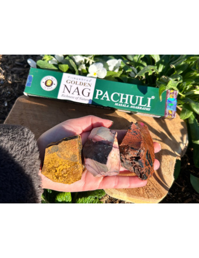 Ce coffret réunit trois pierres brutes naturelles et un paquet d’encens Patchouli pour créer une ambiance apaisante, ancrée et réconfortante à la maison.