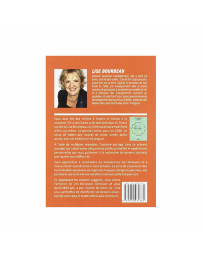 Lise Bourbeau est une auteure et conférencière canadienne. Fondatrice de l’école Écoute ton corps, l’un des plus grands centres de développement personnel au monde francophone. Reconnue pour son approche simple et accessible, elle a publié de nombreux ouvrages à succès sur la connaissance de soi, la guérison émotionnelle et spirituelle. Ses livres, traduits dans plusieurs langues, ont aidé des millions de personnes à mieux se comprendre et à s’épanouir. Notamment grâce à l’écoute de leurs besoins profonds et à l’amour de soi.