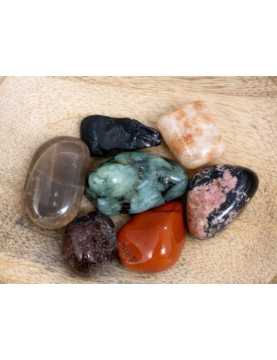 Ce coffret permet d’avoir sous la main tous les minéraux nécessaires pour suivre la formation dans les meilleures conditions, tout en constituant une base complète de pierres aux énergies complémentaires : ancrage, vitalité, cœur, intuition, protection et rayonnement.