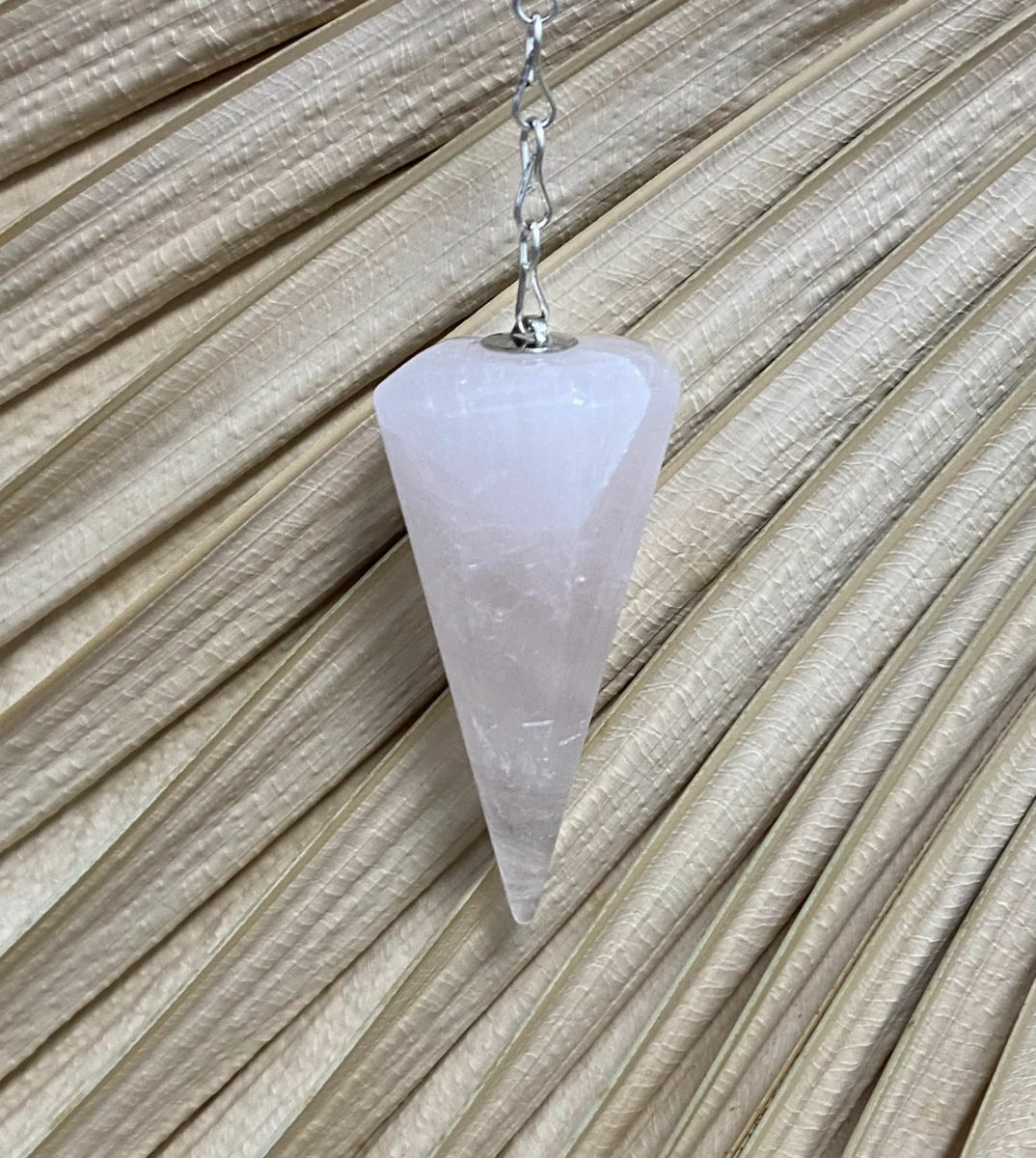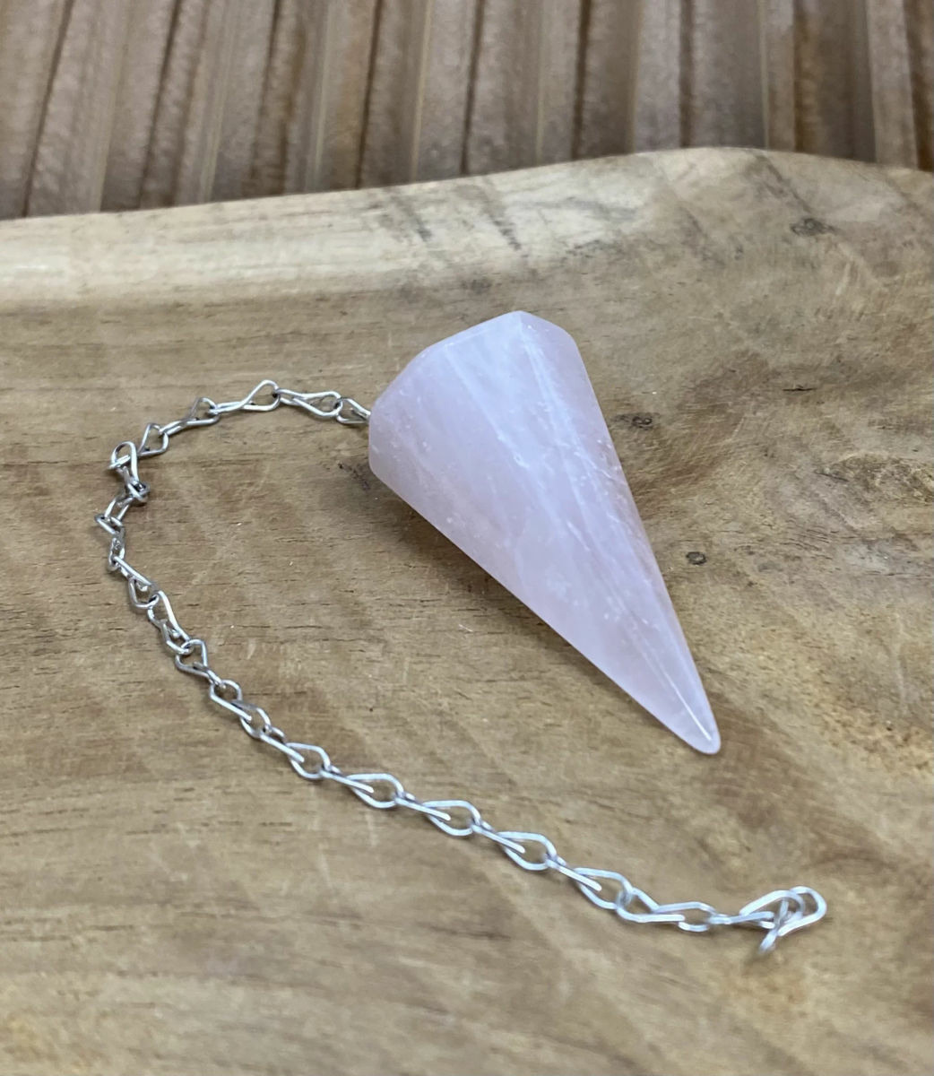 En lithothérapie, le pendule quartz rose, un outil utilisé pour canaliser l'énergie des cristaux et des pierres. Afin de répondre à des questions, d'effectuer des diagnostics énergétiques ou d'équilibrer les chakras. Le pendule en lui-même est généralement constitué d'une petite pierre, d'un cristal ou d'un matériau naturel associé à une chaîne ou à un fil.
