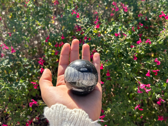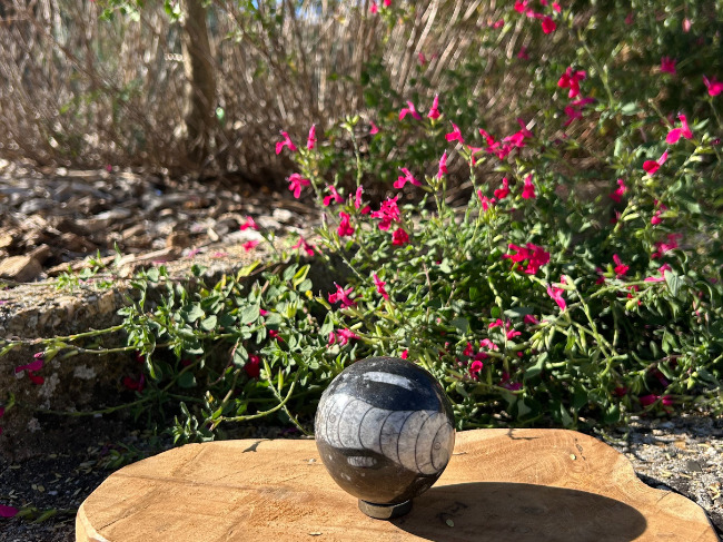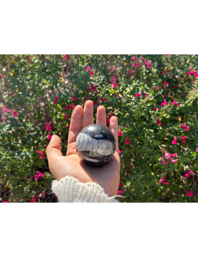 âš La sphĂšre en OrthocĂ©ras est une vĂ©ritable Ćuvre de la nature : une pierre de mĂ©moire, de force tranquille et dâĂ©quilibre, parfaite pour harmoniser les lieux et les Ă©motions.