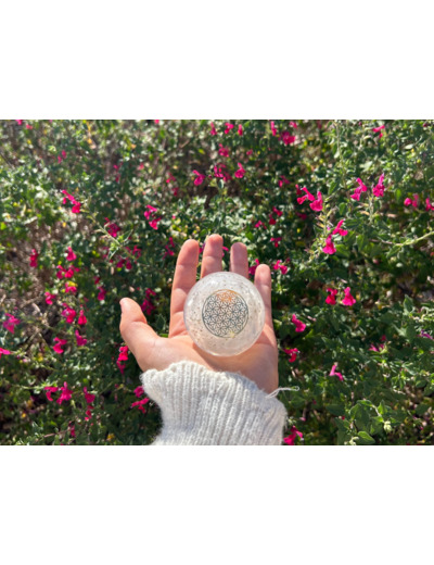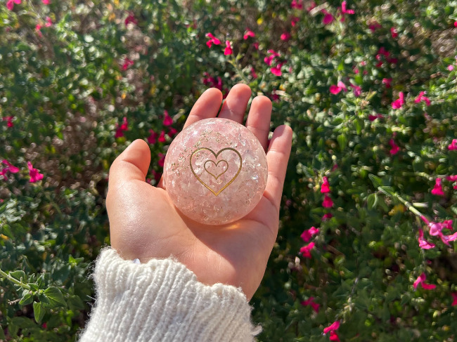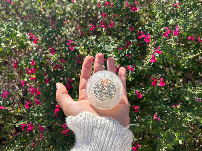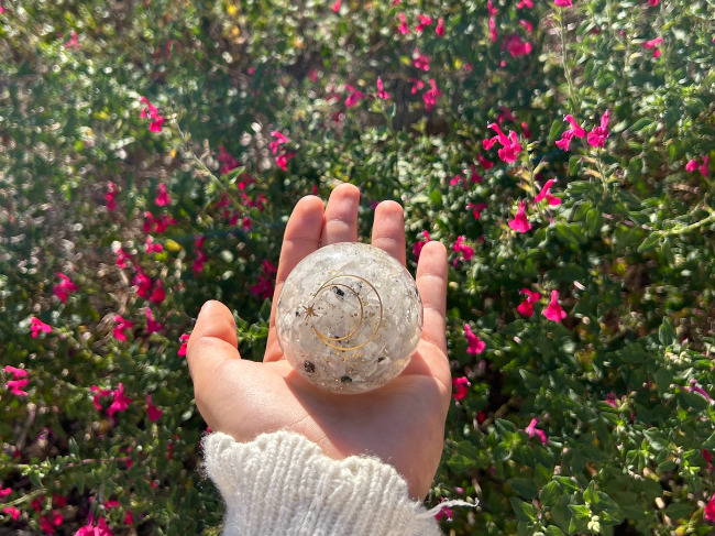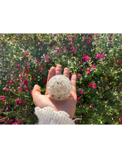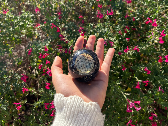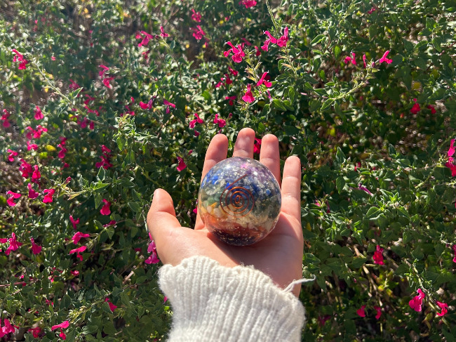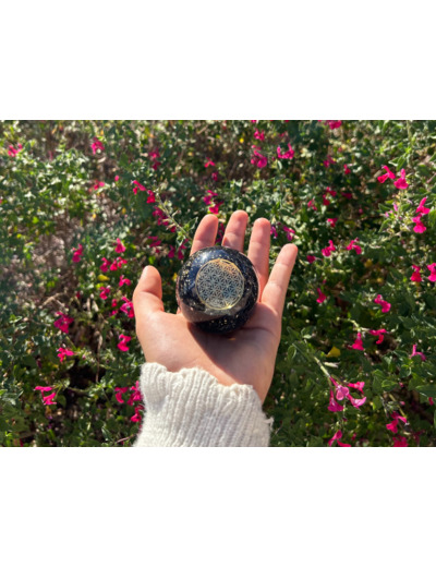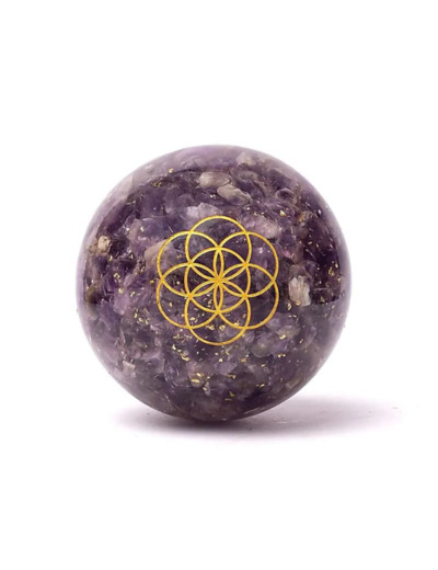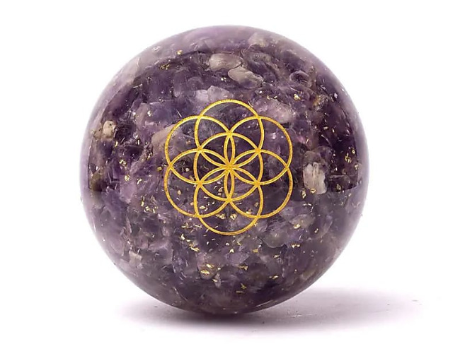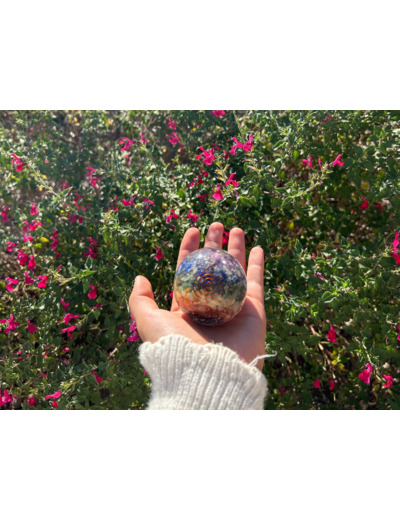 À l’intérieur de cette sphère d’orgonite, de petits fragments d’améthyste sont suspendus dans la matrice de résine. L’améthyste est depuis longtemps appréciée par les thérapeutes en cristaux pour sa capacité présumée à encourager la clarté mentale et la stabilité émotionnelle. Sa teinte violette est souvent associée au chakra couronne, centre de l’intuition et de la perspective