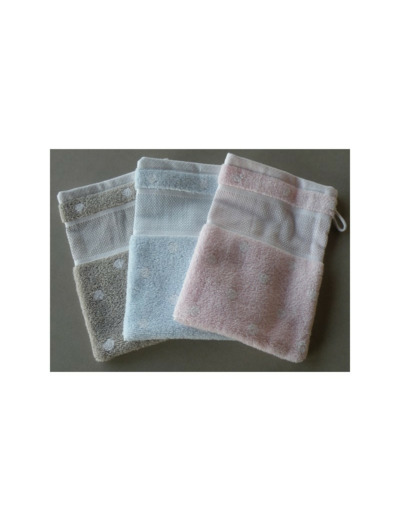 Gant de toilette à broder, article en belle qualité d'éponge avec bande aïda 5.5/cm pour point compter. Vous pouvez broder un prénom ou des motifs enfantins que vous trouverez dans le livre n° 139 RICO (voir rubrique livre / RICO POINT DE CROIX)