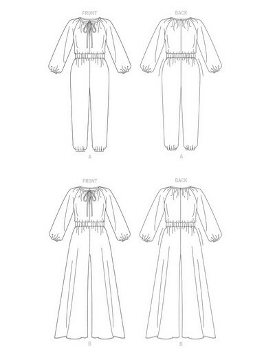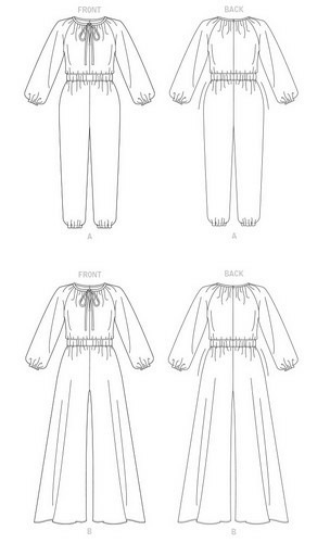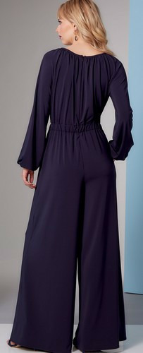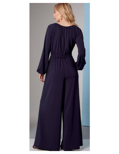 Combinaison à taille élastique, corsage ample et pantalon évasé resserré aux chevilles selon votre choix. Fermeture à glissière invisible au dos et poches sur les côtés.