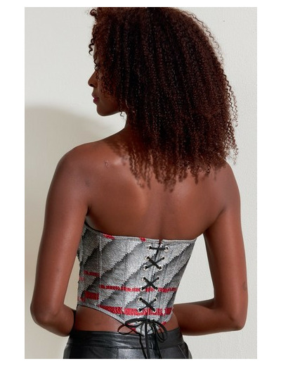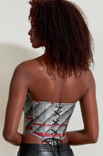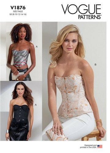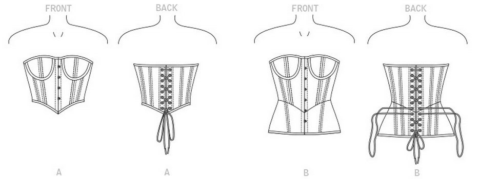 Corset moulant, entoilé, baleiné, doublé à soutien-gorge avec armature, finition à bordure de biais continu, lacet au dos, variations de longueur.