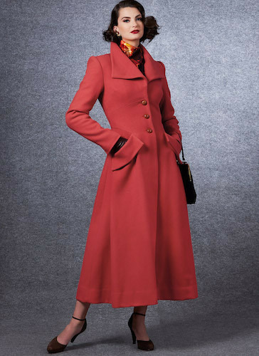 Manteau doublé A-B à corsage ajusté, poches à rabats au côté devant, manche en deux parties à fente et plis au milieu dos . A: Dessus de col et parementure de corsage contrastants . A-B: Boutonnières passepoilées facultatives.