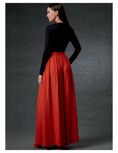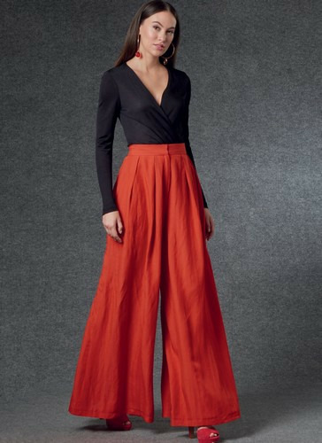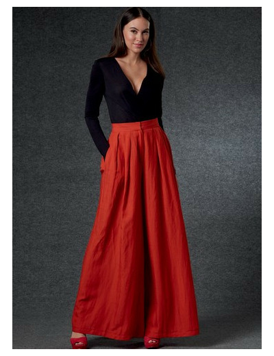 Pantalon : Pantalon très ample à plis souples et poches dans les coutures latérales, ourlet piqué. A : Fermeture à glissière invisible sur le dos. B : Devant à fausse braguette. A,B : Ceinture à fermeture à crochet.