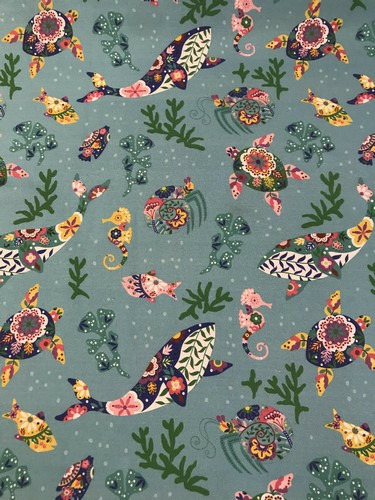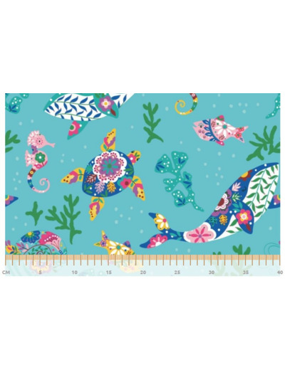 Tissu canvas, coton épais avec des motifs marins et tropicaux dans des couleurs vives sur un fond turquoise.