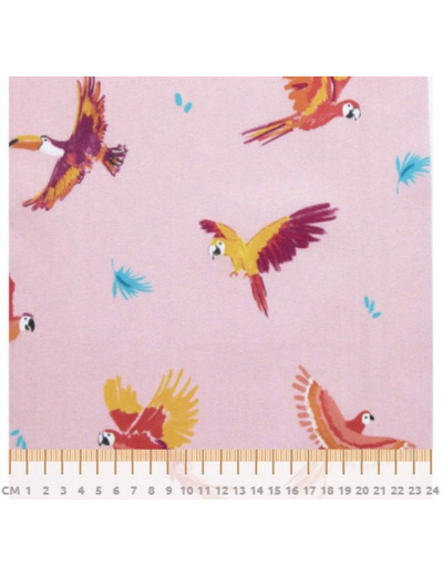 Tissu perroquets tropicaux violet, orange, jaune... sur fond rose.