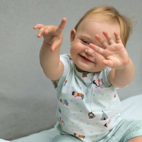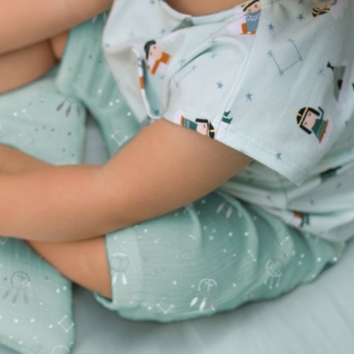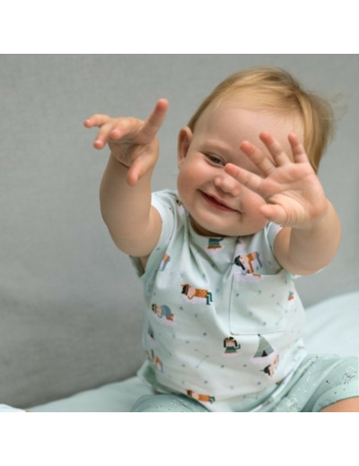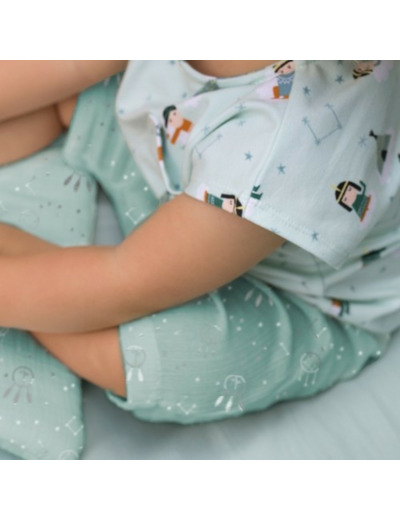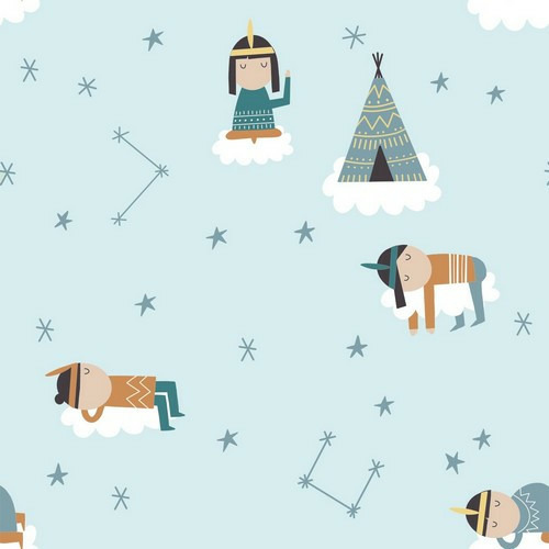 Tissu jersey coton Happy dreams Katia Fabrics, aux dessins d'indiens américains sur fond vert d'eau. Idéal pour la confection de vêtements confortables et légers pour le printemps et l'été : robe, tee-shirt, pyjamas...