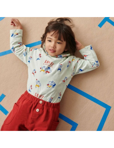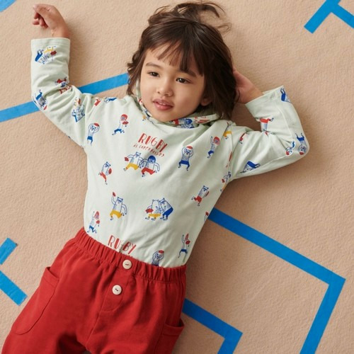 Tissu jersey de coton, imprimé joueurs de rugby dans des tons de rouge,bleu, jaune sur fond vert d'eau