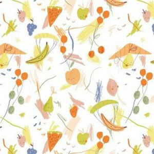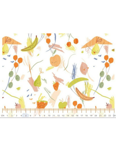 Tissu popeline aux dessins à la main levée de fruits en plein vol. Des pommes, des myrtilles, des bananes, des fraises et du raisin volant haut dans le ciel en parapente ou ballon de la même forme que ces fruits. Profitons de l'énergie que nous donne les fruits !