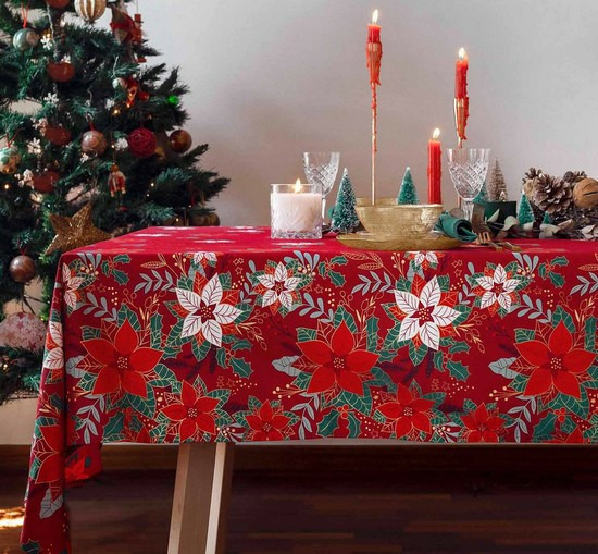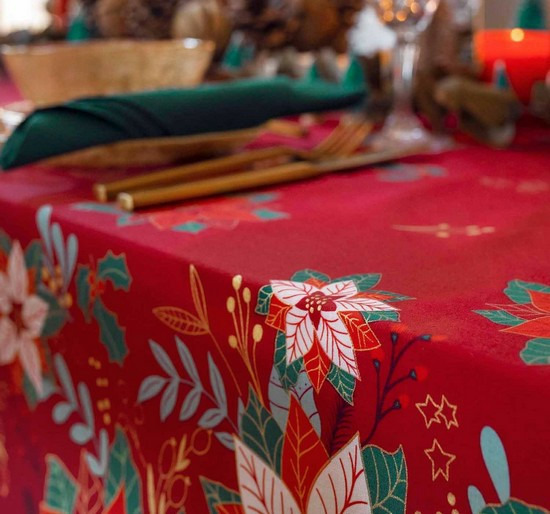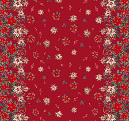 Tissu coton imprimée de motifs de Noël : fleurs rouge poinsettia ou fleurs de Noël ornés de doré sur fond rouge. Tissu parfait pour préparer votre déco pour les fêtes de fin d'année. Créez un univers de Noël fait main : nappe, serviettes, chemin de table.