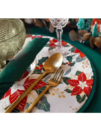 Tissu coton imprimée de motifs de Noël : fleurs rouge poinsettia ou fleurs de Noël ornés de doré sur fond blanc. Tissu parfait pour préparer votre déco pour les fêtes de fin d'année. Créez un univers de Noël fait main : nappe, serviettes, chemin de table, blouse, robe, veste...