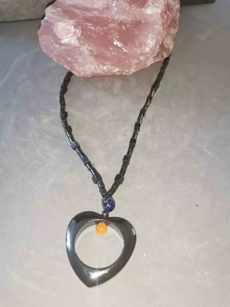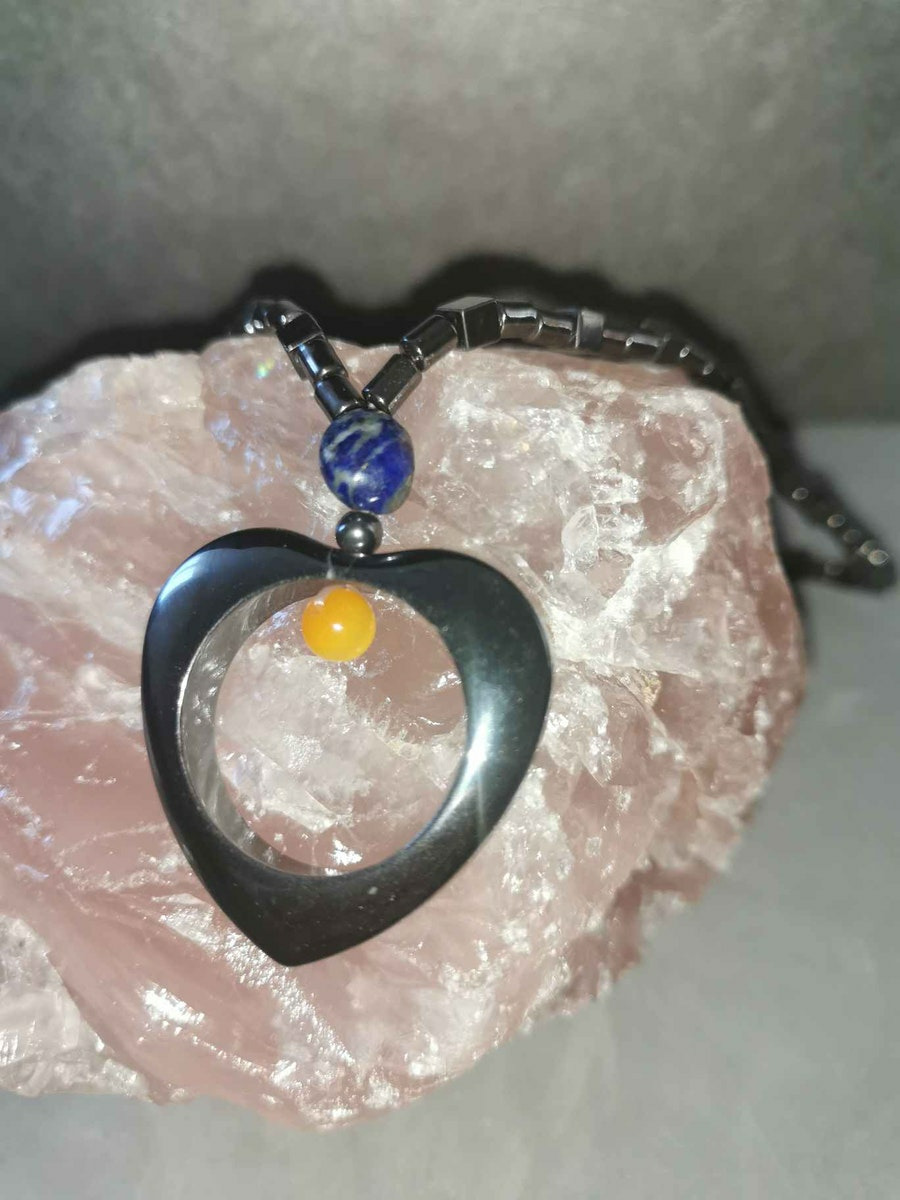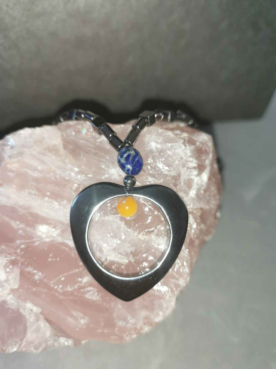 Collier Hématite avec pierre de lapis lazuli et perle oeil de chat - fabrication artisanale