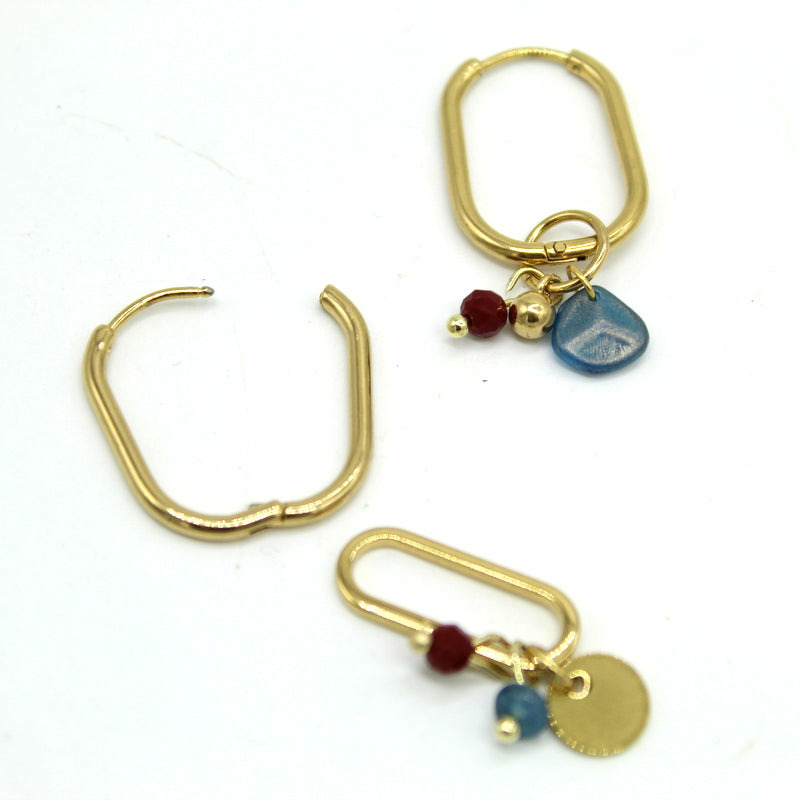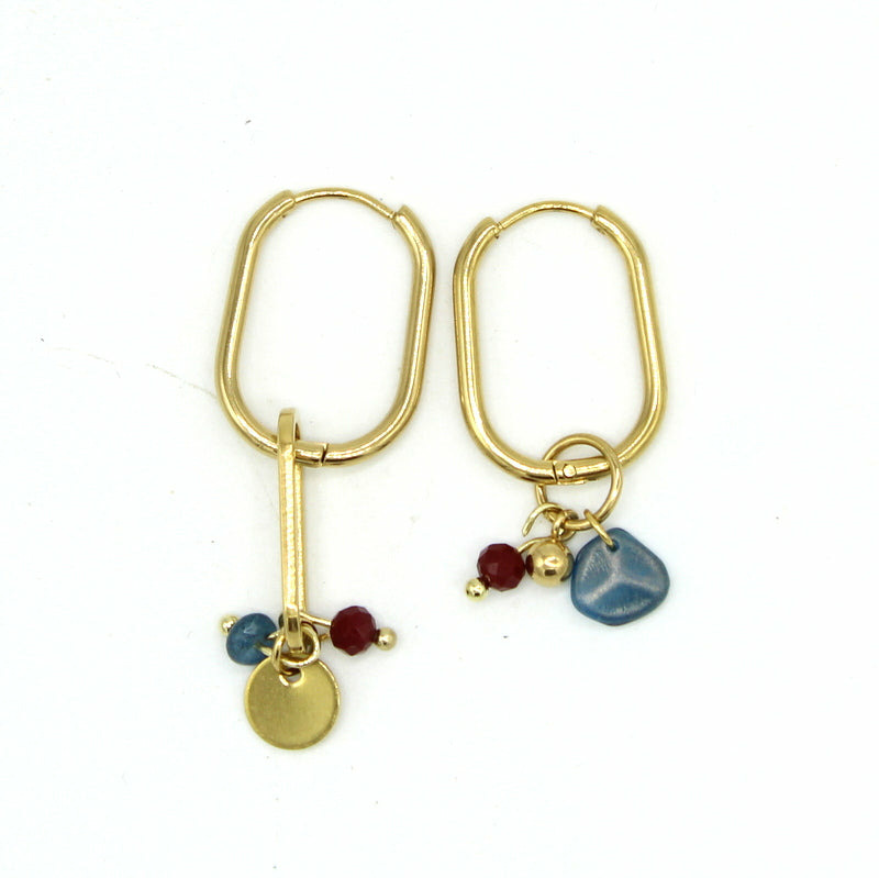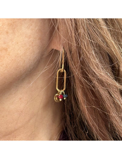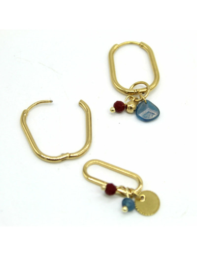Créoles asymétriques en acier doré avec des pampilles amovibles. Elles se portent au choix, épurées ou enrichies de détails. Une pièce modulable qui s’adapte aux envies. Perles en verre bordeaux et bleues.