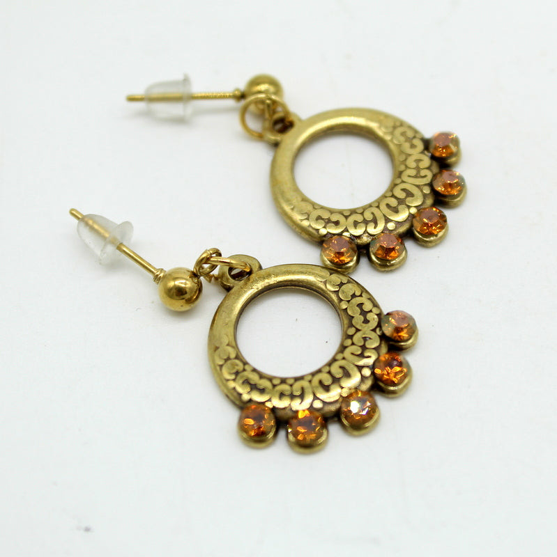 Boucles dorées avec un motif doré gravé et une touche de cristal Swarovski marron scintillant. Une pièce délicate qui associe finesse et éclat.