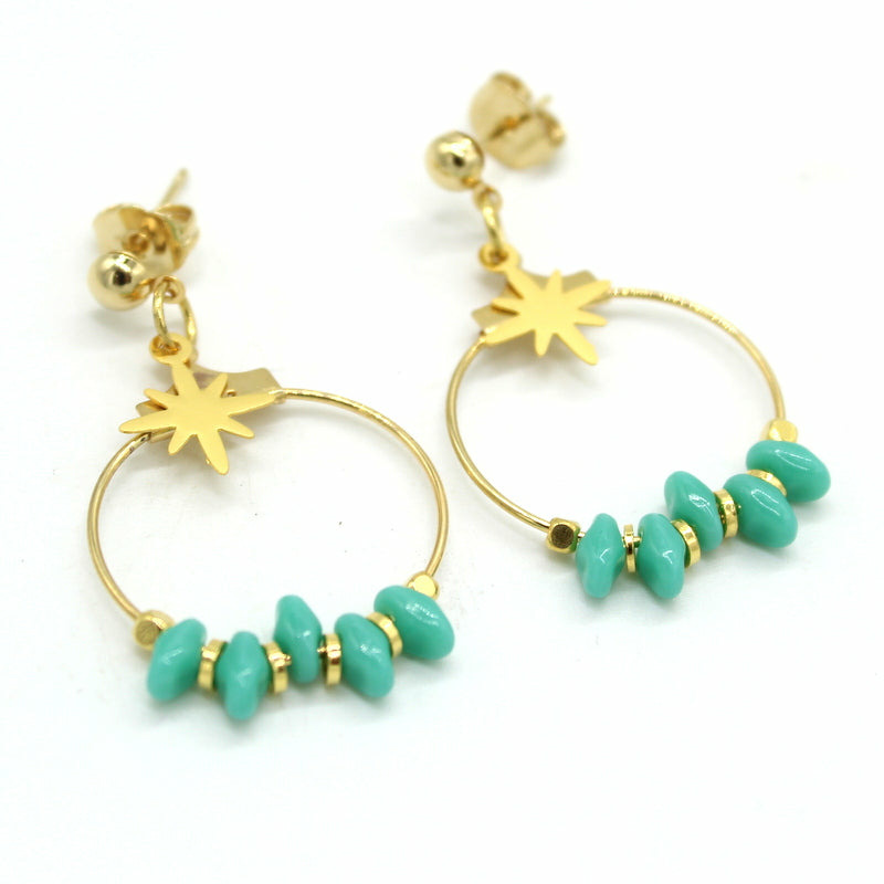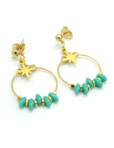 Boucles d'oreilles fermoir puce avec papillons dorés à l'or fin, perles en verre turquoise.