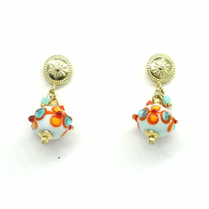 Boucles d'oreilles fermoir en acier, perles en verre de Murano mint décor bleu lagon, orange, corail.